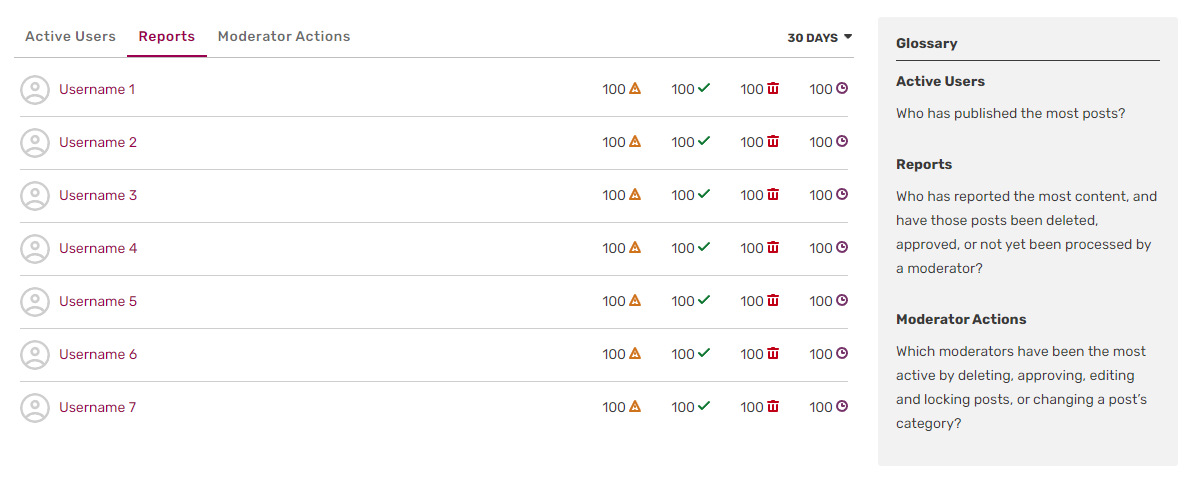 Reports lists those users who have reported the most posts in Discussions. The list also shows how many of their reported posts have subsequently been deleted, approved or are still awaiting moderation. You can use this to identify users who care about the community, know the rules well and can tell good posts from inappropriate posts. Someone who reports many posts that then get deleted is likely a good candidate for moderator.