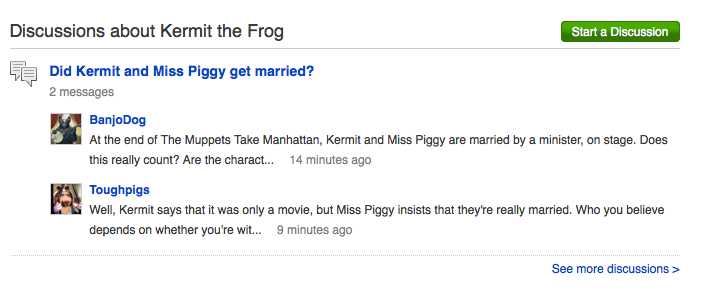 On Muppet Wiki, discussions about Kermit are linked at the bottom of his article page.