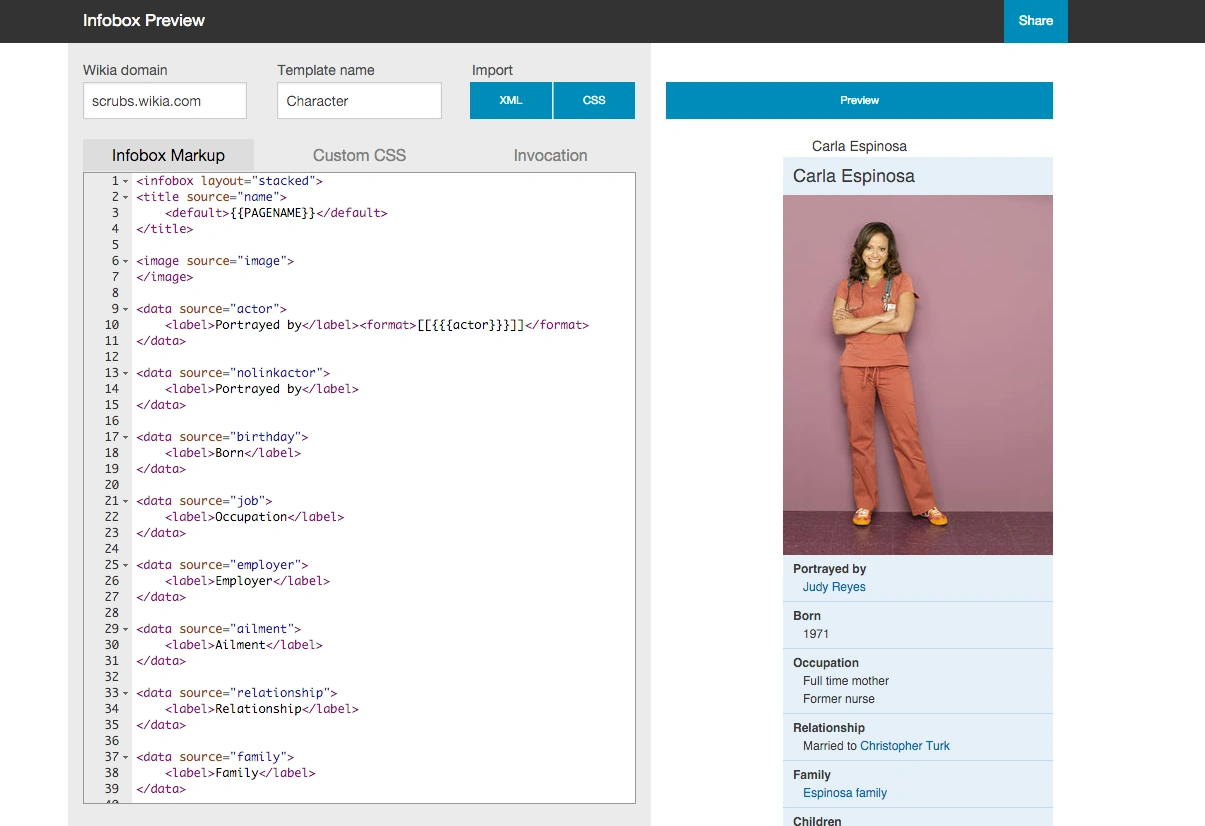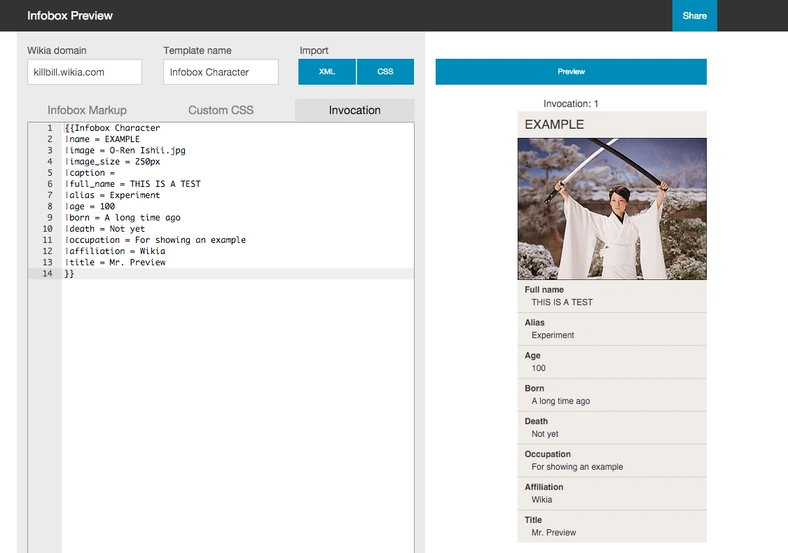 Every time you click the "Preview" button the tool looks at the contents of all three tabs — Infobox Markup, Custom CSS, and Invocation — and the provided wiki URL and template name to generate a preview. It will identify where the template is already used on your community and show up to 10 examples of how the template will render with any new code you have provided.