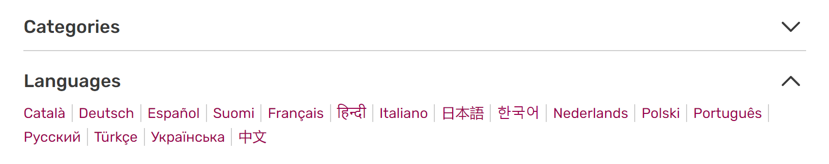 Unlike interwiki links, which appear inline, interlanguage links appear in the "Languages" list below the main content area of a page under the categories.