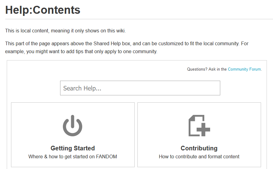 Shared Help pages are any pages in the Help: namespace on Community Central. These pages will show up on your wiki at the same article name location, contained in a box. At the top-right of the box is a link to the Community Central forums.