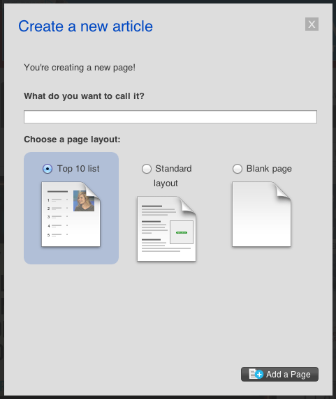 An option in the Add a Page pop-up, when using the classic editor that appeared when Top 10 Lists were enabled