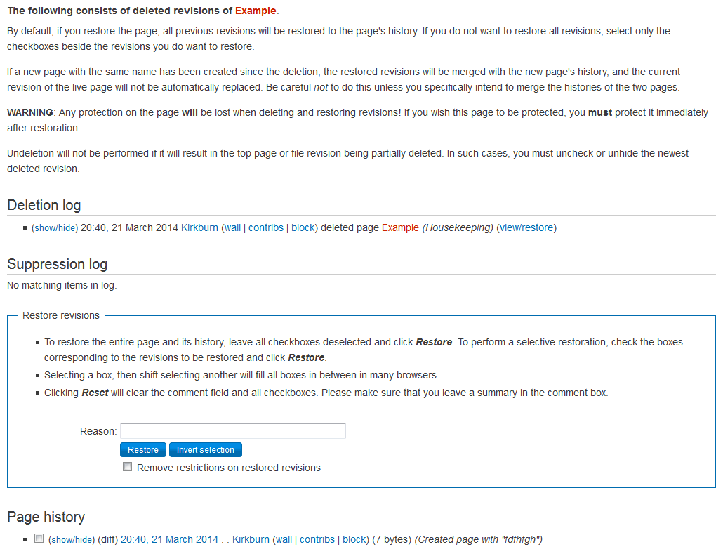 • In the "Restore revisions" box, take a read of the brief directions, then you can add a restoration reason in the "Reason" box.