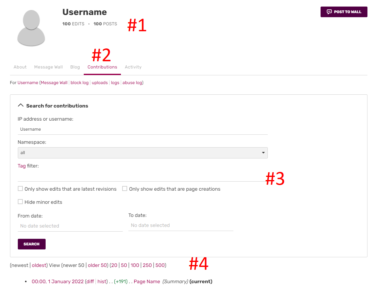 User contributions pages list the edits that a particular user has made on a specific community. They allow you to see what edits others have made as well as keep track of your own edits.