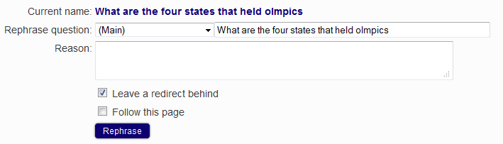 You will then be brought to a new page, where you can rephrase the question. The new question will create a new page on the wiki, so make sure to check the box that says, "Leave a redirect behind ". This is redirect the old question, to the newly rephrased question. Then click on move page button (which may say save or rephrase depending on if it has been modified) to save.