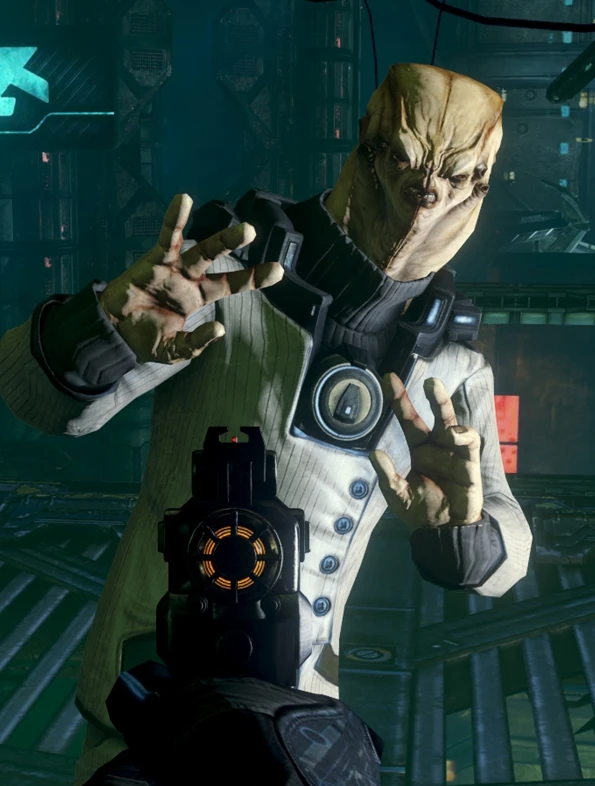 This is the second most seen race, and the first race seen in prey 2 that did not appear in prey 1. When Killian crawls too his badge in the bounty trailer, he turns and is knocked out by one. This alien has four glowing eyes, no nose, a strange shaped mouth and head. in some screen shots you can see their legs and feet, it is important to note they have hooves and digitigrade legs. Their hands have four very short fingers, their index finger has a long claw that curves seemingly to make up for a lack of dexterity. This race is the only one seen thus far outside of exodus (upon the sphere) which tells me some of them either were victims of the spheres madness, or they had relations with the keepers.